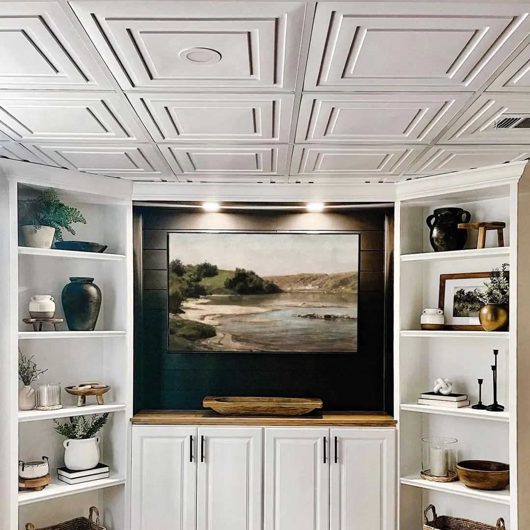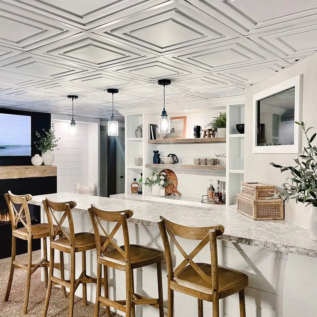 Ces tuiles se distinguent des vieux panneaux industriels en fibre de carton que vous connaissez bien. Elles ne produisent pas de poussière et sont étanches à l’eau, éliminant ainsi le risque de formation de bactéries et de moisissures. Fabriquées à partir d'un vinyle pur, ces tuiles sont simples à nettoyer et à entretenir. Une fois que vous les aurez insérées dans les rails de suspension conventionnels (grille de suspension standard - barres en T de 1 po ou 15/16 po), vous serez ravis du résultat.
